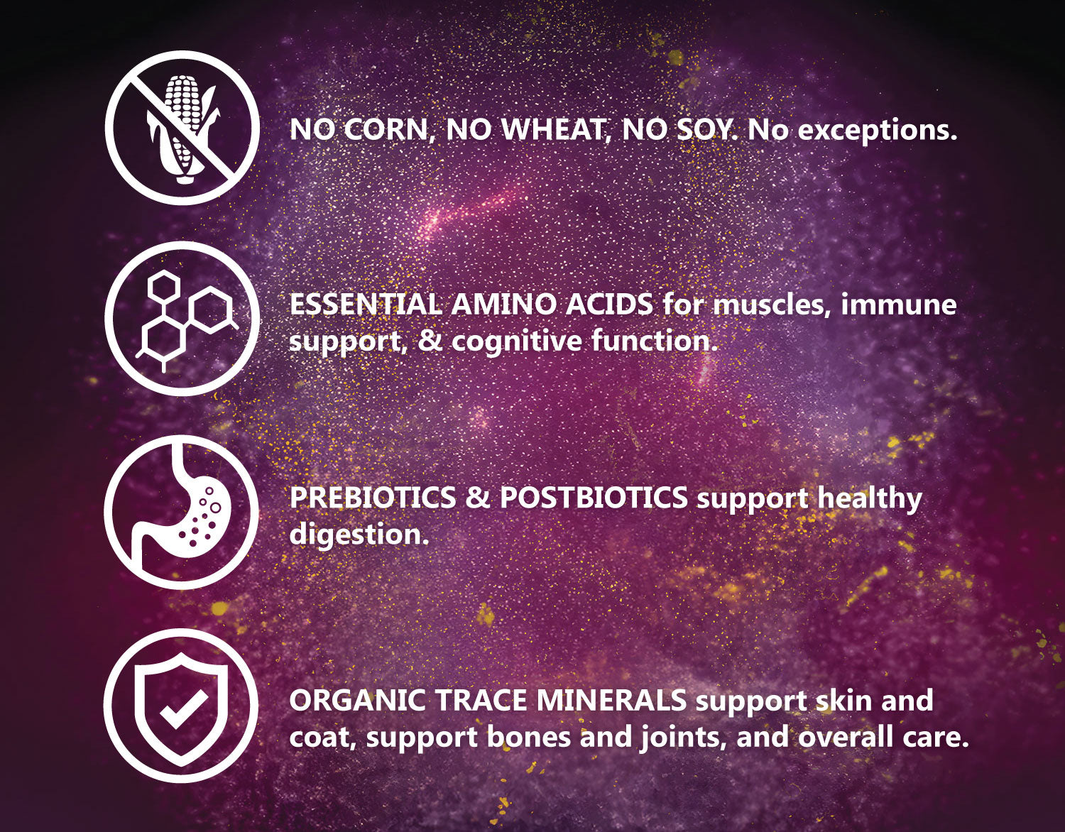 We built Unrivaled with one simple goal: create clean, balanced nutrition at a value. Every formula starts with a strict “no corn, no soy, no wheat” foundation, so your pet’s stomach can digest the food without unnecessary fillers or allergens. We use a carefully balanced blend of essential amino acids that support muscle maintenance, bolster immune function, and aid in the production of enzymes and hormones.